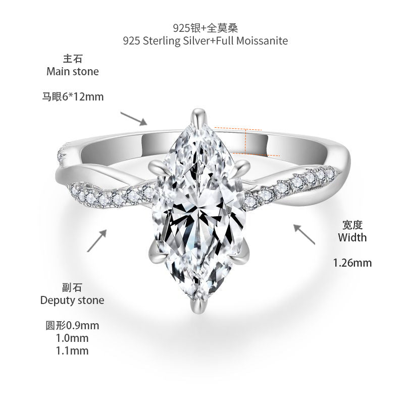 This ring set captures the romance of classic engagement jewelry while embracing today’s values: sustainability, clarity, and conscious luxury. The marquise-cut stone — often associated with royalty and refined taste — commands attention with its elegant pointed ends and brilliant faceting. Unlike mined diamonds, lab-grown moissanite offers identical optical properties (refractive index, dispersion) with greater hardness and ethical assurance. The sterling silver band is polished to a radiant luster and engineered for durability and everyday resilience. Whether worn as an engagement statement, anniversary gift, or self-celebration piece, this set balances bold presence with wearable subtlety.