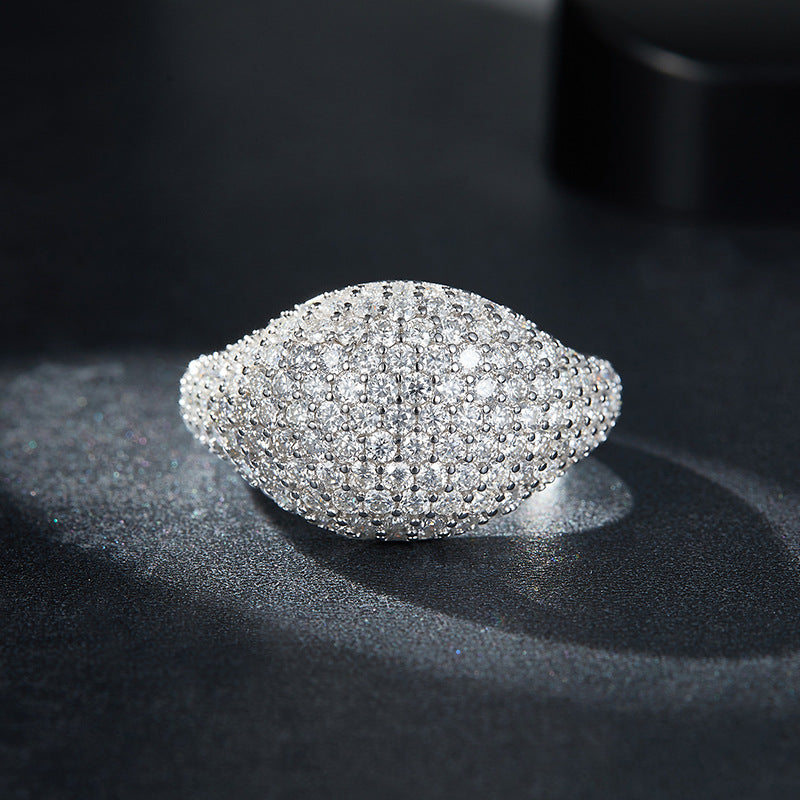 This isn’t just another trend-led accessory — it’s a carefully considered fusion of contemporary design language and accessible luxury. The ring’s architecture reflects current streetwear sensibilities: structured yet expressive, minimal but never understated. Each moissanite stone is precision-set to catch light from every angle, delivering fire and brilliance comparable to fine diamond jewelry — without the premium price tag. The white gold plating enhances brightness while complementing cool-toned metals and skin undertones. Whether worn solo as a signature piece or layered with other rings, its balanced geometry ensures visual harmony and modern appeal.