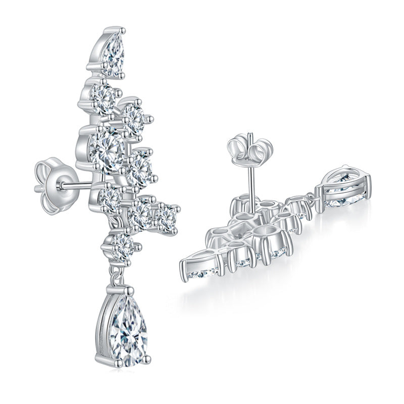 Each earring features one 5 × 8 mm pear-shaped moissanite stone — a flattering elongated proportion that adds visual length to the earlobe.