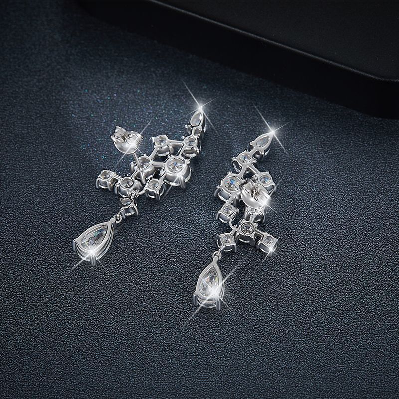 • Premium pear-shaped moissanite stones (6.1 total carats) for exceptional fire and clarity