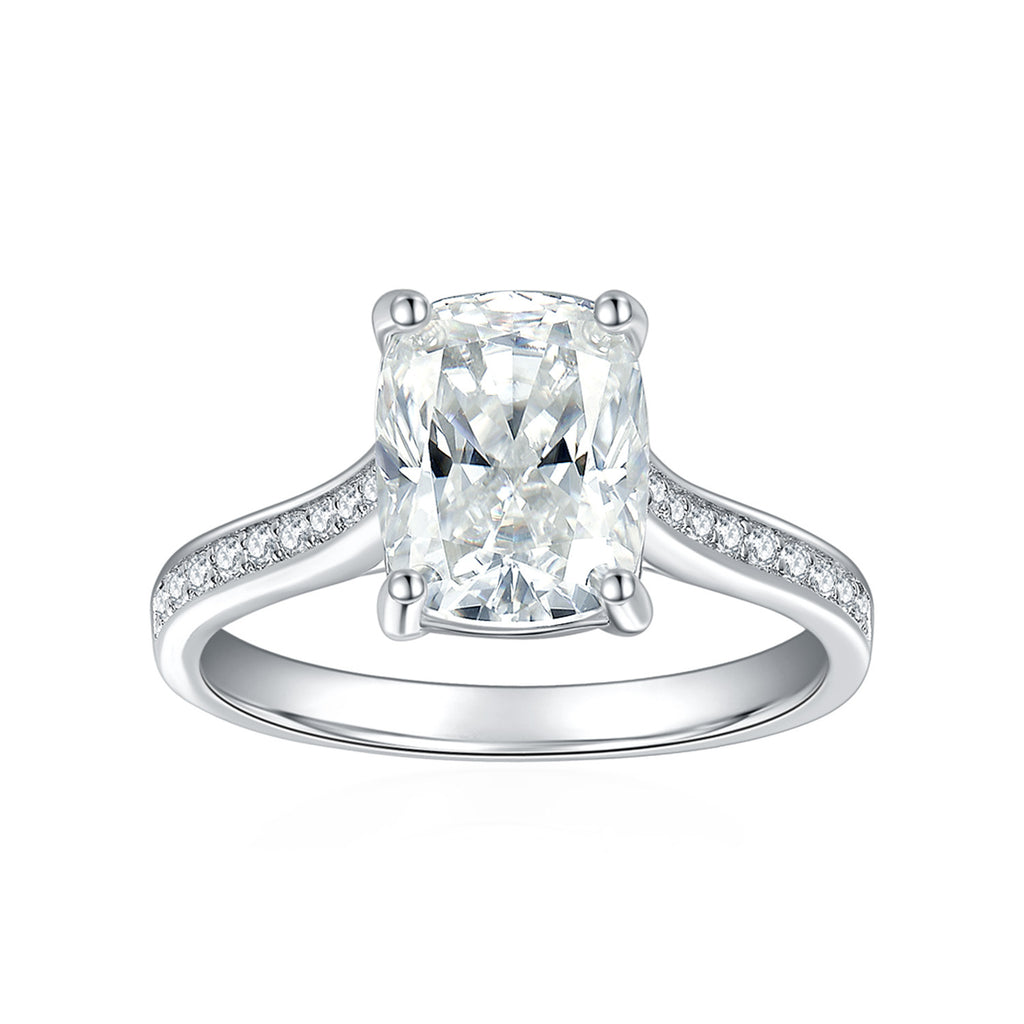 • Dimensions: 7 mm × 9 mm oval moissanite center stone
