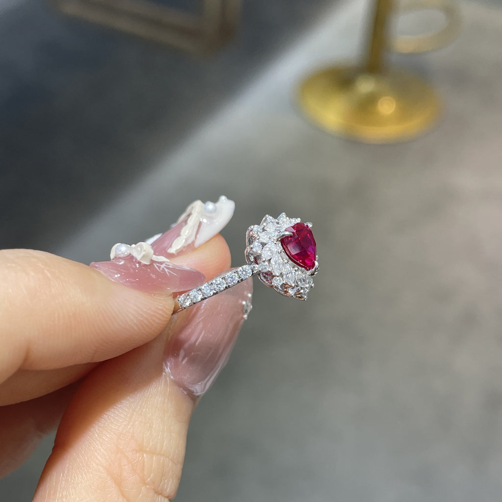 • Dimensions: Center stone 6 mm (0.24 in) heart-shaped ruby; total ring width approx. 8 mm at heart point