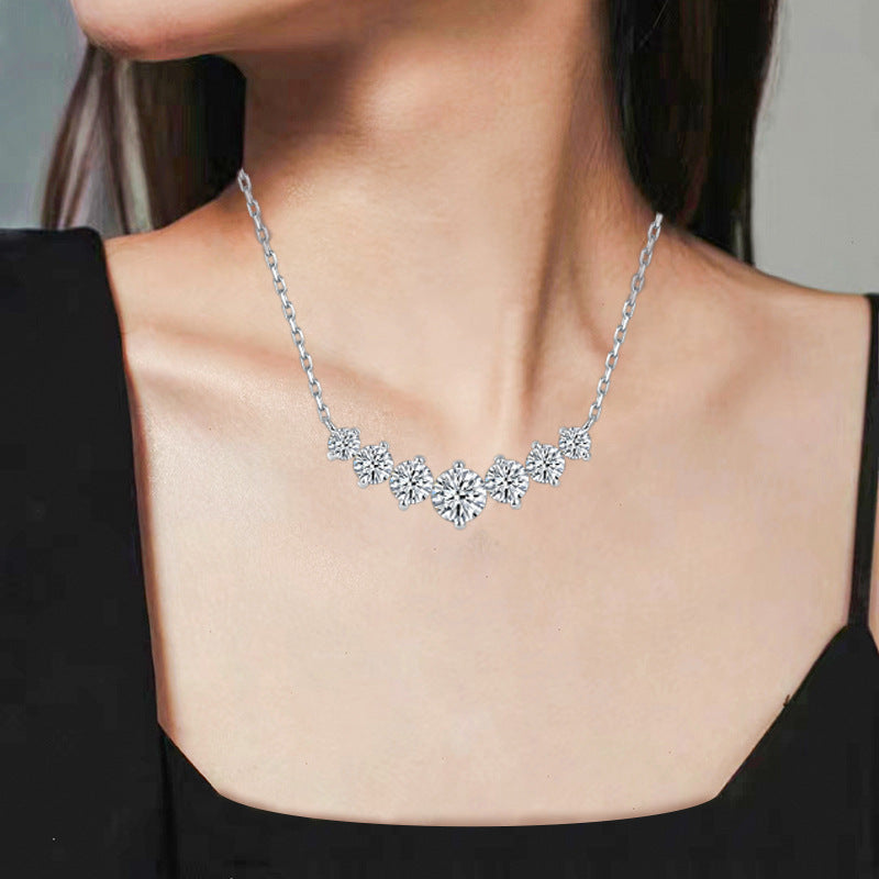 This necklace balances playful symbolism with refined craftsmanship. The 'smile' motif is rendered in sharp, precise geometry — not whimsical curves, but confident, architectural lines that reflect current streetwear and minimalist jewelry trends. Each moissanite stone is carefully calibrated for maximum brilliance and consistency in color and cut. The white gold plating enhances the cool, luminous tone while complementing a wide range of skin tones and wardrobe palettes. Whether worn solo for subtle impact or layered with complementary chains, this piece communicates individuality with quiet sophistication.