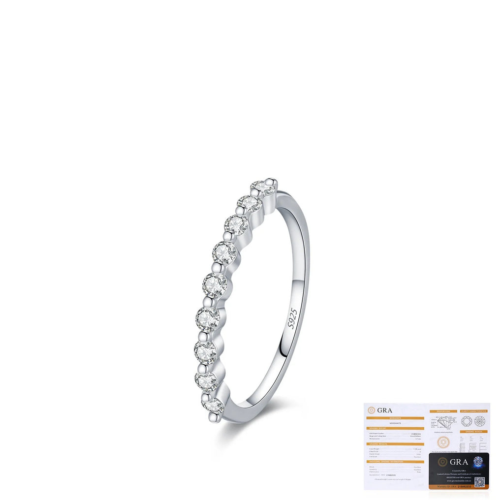 This ring redefines understated luxury. Its sculptural geometric band — sharp yet balanced — anchors a delicate row of precisely set moissanite stones that catch light from every angle. Unlike mass-produced fashion rings, each piece is finished to jewelry-grade standards: polished edges, consistent stone alignment, and a smooth interior for comfortable fit. The VVS1 clarity grade means inclusions are extremely difficult to detect even under 10x magnification — delivering exceptional visual purity and sparkle. Crafted in solid 925 sterling silver, it offers the rich look of precious metal at an accessible price point. The electroplated surface adds depth and resilience while preserving the metal’s natural warmth. Ideal for those who appreciate intentional design, quiet confidence, and pieces built to live in your daily rotation — not just special occasions.