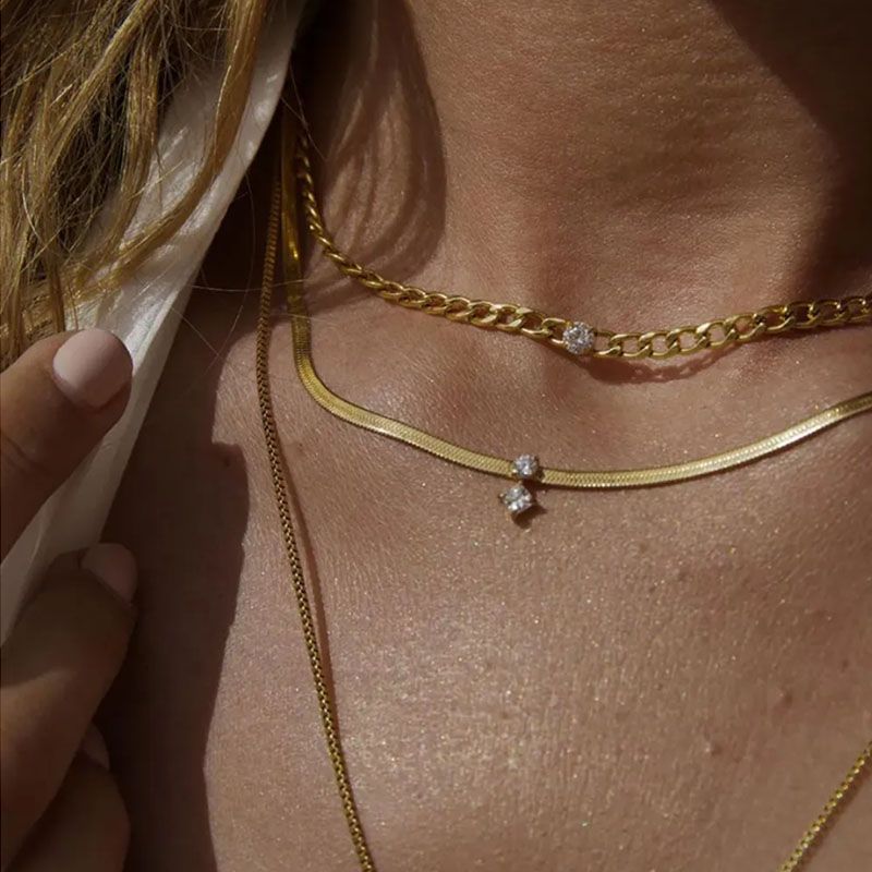 Wear confidently as a standalone statement or layer with complementary chains for dimension. To preserve its luster, store separately in a soft pouch or jewelry box when not in use. Avoid contact with perfumes, lotions, chlorine, or saltwater. Gently wipe with a microfiber cloth after wear to maintain shine. Electroplating helps retain color over time with proper care — avoid abrasive cleaners or polishing cloths intended for solid gold.