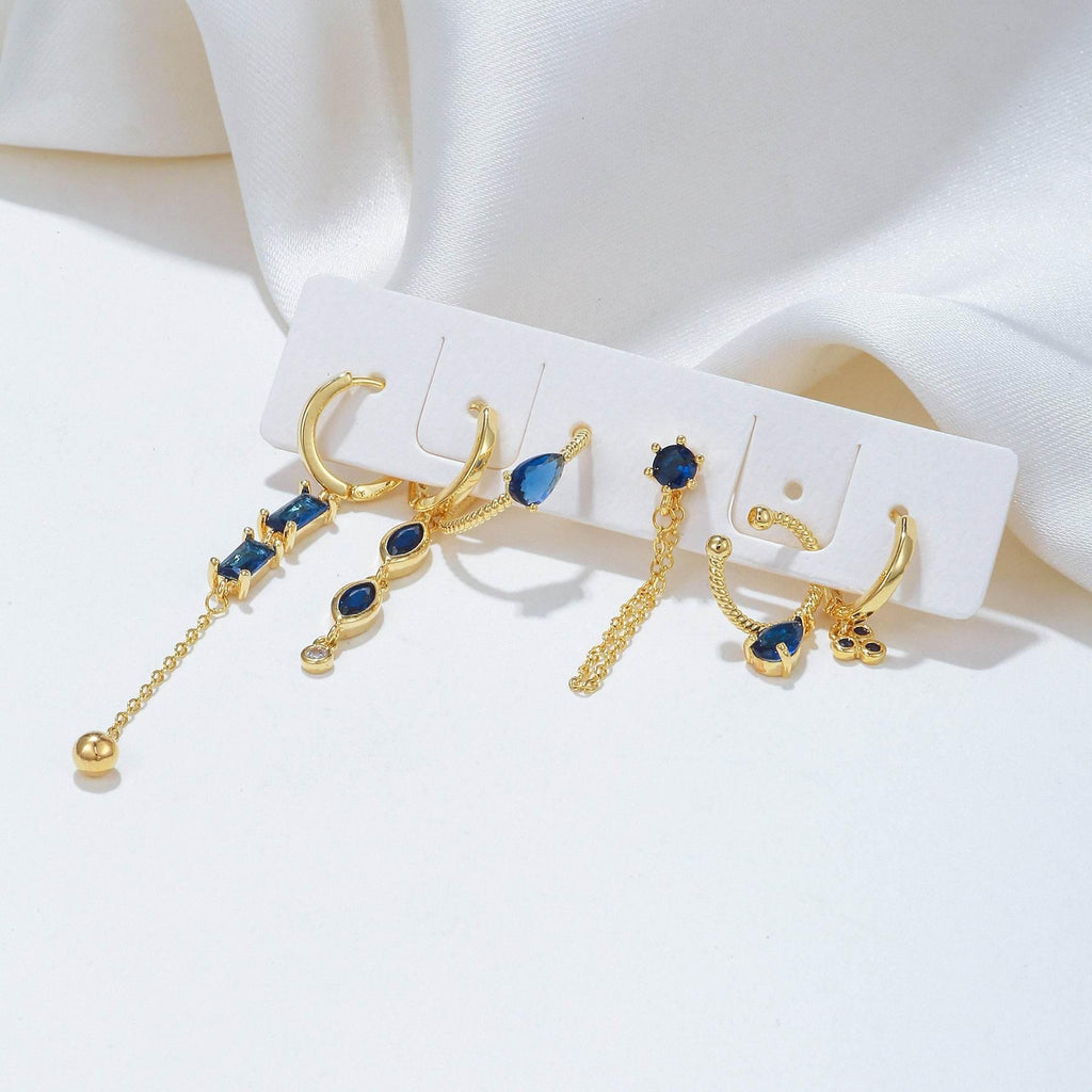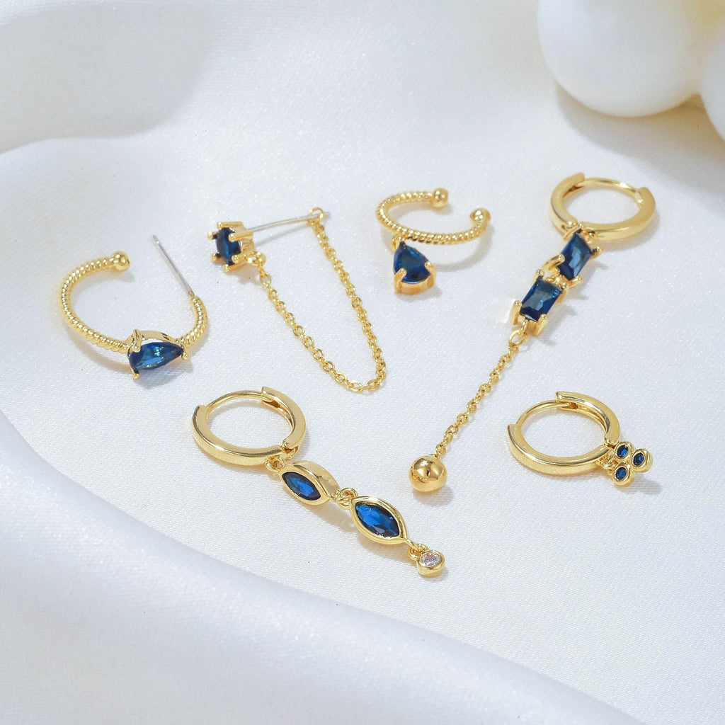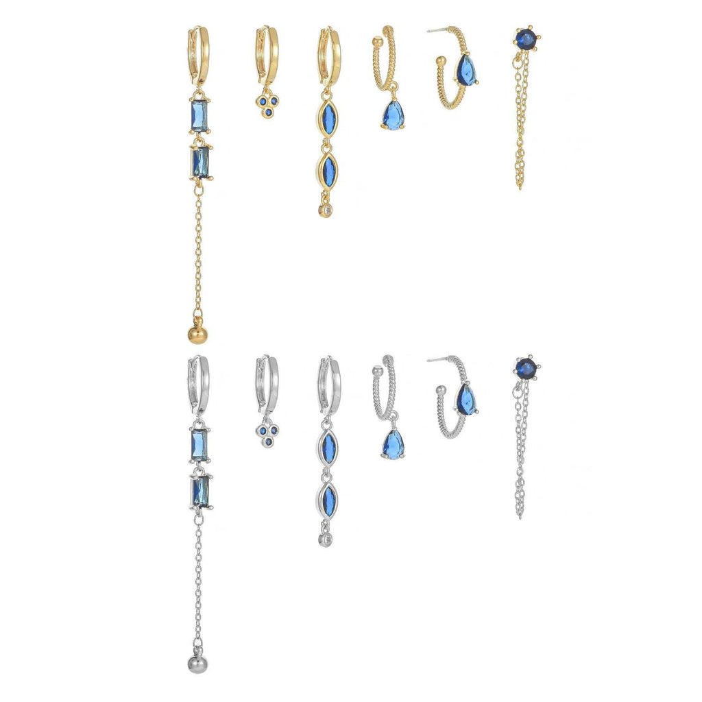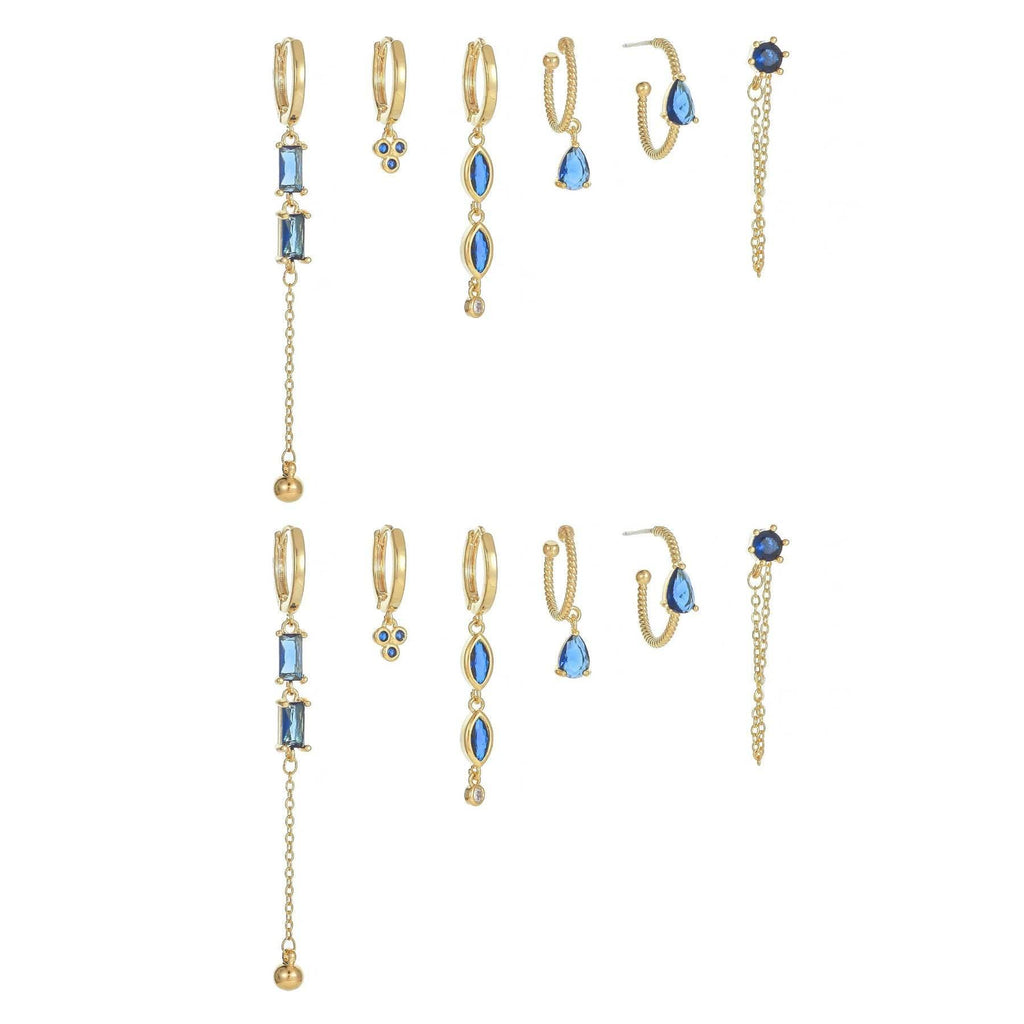 6 Pieces Long Tassel Vintage Earring Set with Micro-Pavé Dazzling Blue Zircons, 18k Gold Plated Ear Studs & Ear Drops, S925 Needle, Stacked Lobe Designs with Dazzling Zirconia