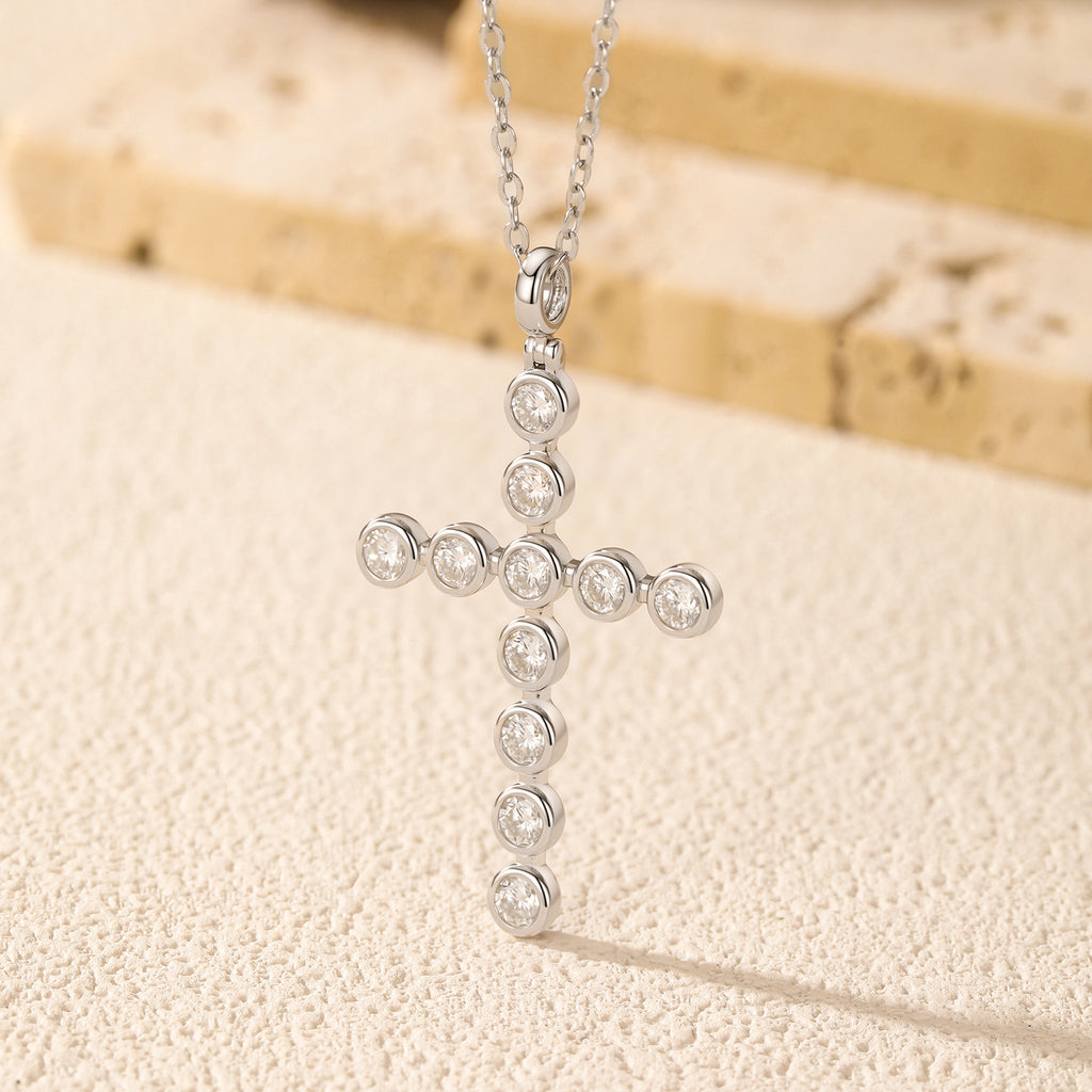 This cross necklace blends timeless symbolism with contemporary minimalism. The pendant’s sharp, symmetrical geometry reflects current fashion sensibilities—ideal for those who appreciate quiet confidence over bold ornamentation. Whether worn solo for subtle elegance or layered with other fine chains, it transitions effortlessly from weekday meetings to weekend gatherings. The high-polish finish enhances light reflection, while the VVS1 moissanite stones offer consistent sparkle across lighting conditions. Designed with thoughtful attention to proportion, the pendant sits gracefully at the clavicle—neither overwhelming nor understated.