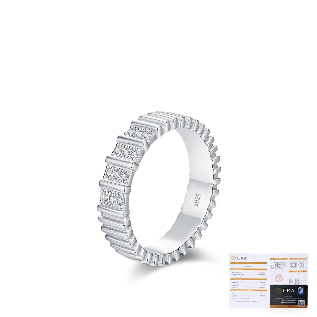 This ring merges contemporary design sensibility with fine jewelry craftsmanship. The band is crafted from solid 925 sterling silver and finished with a subtle electroplated layer to enhance brightness and resistance to everyday wear. Each moissanite stone is hand-set for precision and consistency—delivering fire and clarity that rivals natural diamonds. Its balanced proportions and low-profile profile ensure comfort and versatility: wear it on its own for understated polish, or combine it with textured bands, thin gold rings, or engraved styles for personalized expression. Whether you're building a curated stack or seeking a single standout piece, this ring offers quiet confidence and modern sophistication.