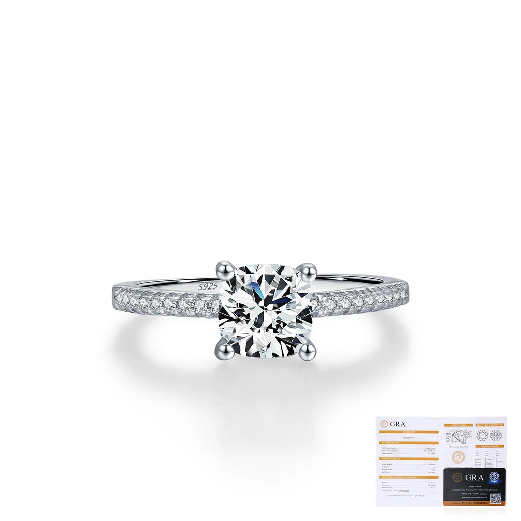 • Brilliant 1-carat-equivalent moissanite center stone with exceptional fire and clarity