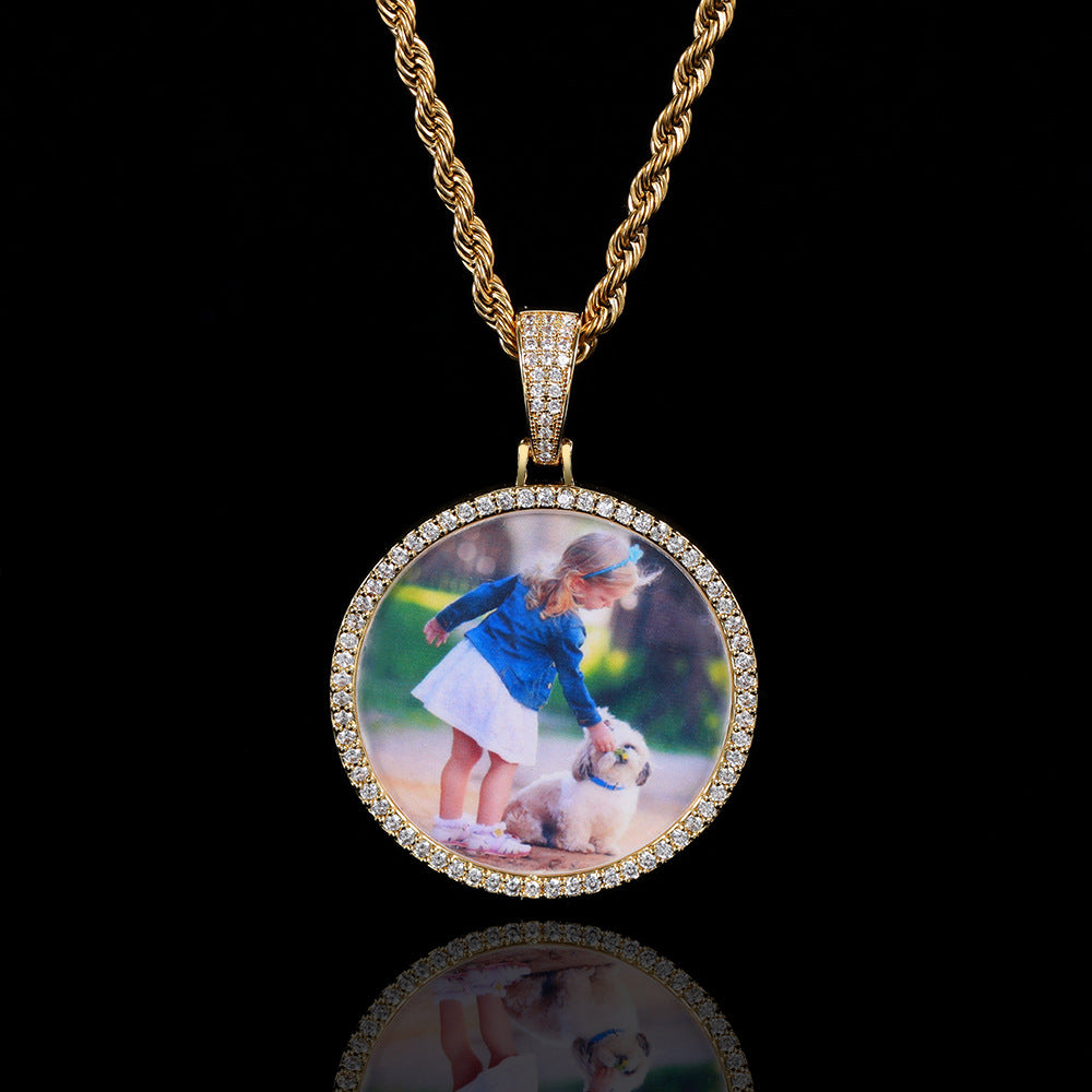 Hip Hop Round Photo Pendant Necklace with Cubic Zirconia in Gold or White Gold