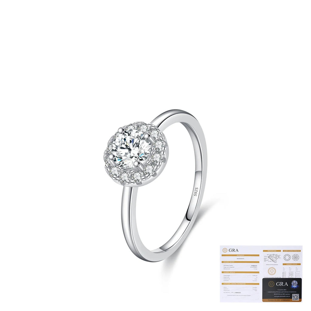 - Precisely cut round moissanite center stone for exceptional fire and clarity